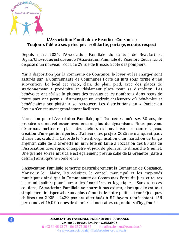Profitant de tous ces changements, l’Association Familiale Du canton de Beaufort et Digna/Chevreaux devient l’Association Familiale de Beaufort-Cousance. Le canton de Beaufort ayant été supprimé depuis 2015, il était grand temps ! Elle continuera à réaffirmer ses valeurs : partage, écoute, solidarité, soutien, accompagnement…. Rappelons aussi que l’Association Familiale aide aux départs en vacances, à résoudre divers problèmes du quotidien, organise des animations locales, participe à la découverte de la culture dans notre territoire, informe et conseille les familles sur leurs droits…